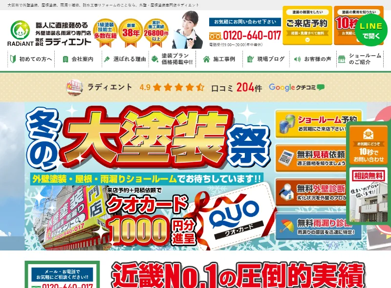 大阪市中央区にあるラディエントは、外壁塗装を中心にリフォーム事業を展開する地域密着型の業者です。関西一円で幅広い施工実績を誇り、高品質なサービスを適正価格で提供しています。お客様満足度No.1を目指し、地域の方に寄り添ったプランニングと丁寧な対応が強みです。