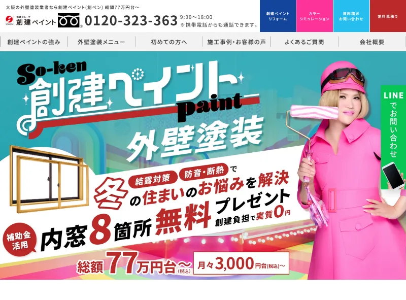 大阪市に拠点を構える創建ペイントは、創建グループの一員として外壁塗装を手がける信頼の業者です。創設75年以上の歴史を持ち、これまでに5万戸超の実績を積み重ねてきました。施工品質の高さはもちろん、メンテナンス技術にも優れ、大手メーカーの塗料を使用することで耐久年数の長い仕上がりを実現しています。