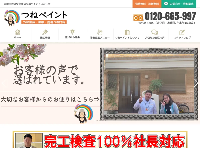 大阪市にある外壁塗装専門店「つねペイント」は、株式会社巧塗装工房が運営する地域密着の業者です。自社職人による高品質な施工を提供し、礼儀・マナーを大切にした対応で、多くの客様から「ありがとう」という喜びの声が寄せられています。