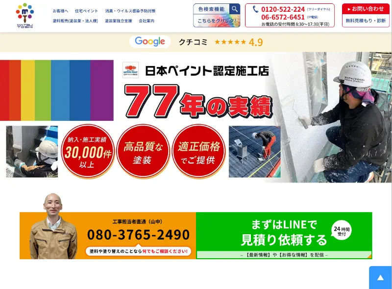 大阪市に拠点を構える株式会社マツトシは、創業77年目を迎える老舗の外壁塗装業者です。総合塗料メーカーである日本ペイント株式会社の特約店として、認定施工店の資格を持ち、確かな施工技術を提供しています。