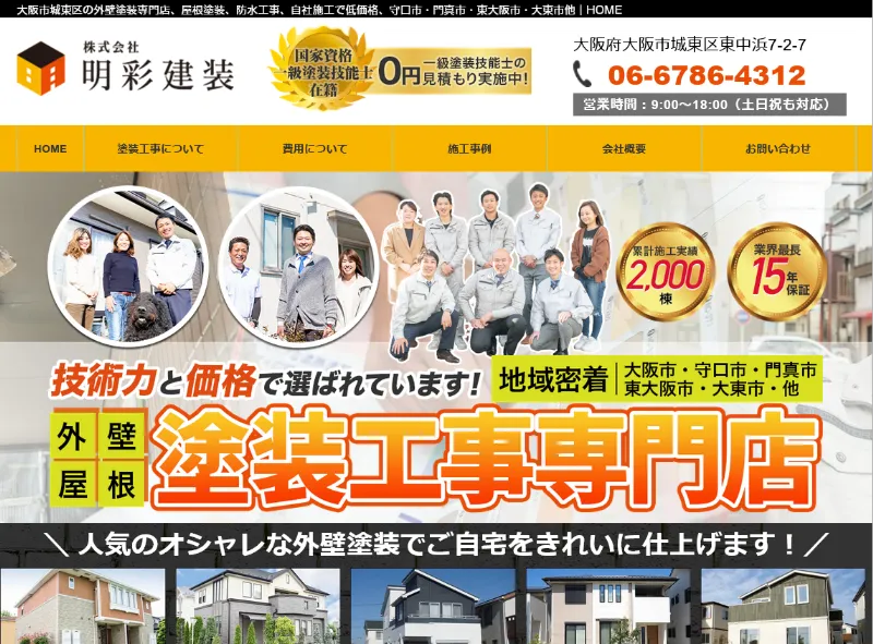 大阪市城東区に拠点を構える株式会社明彩建装は、地域密着型の塗装工事店として外壁塗装・屋根塗装を手がけています。21年の経験を積んだ塗装職人が、自社施工で誠心誠意対応。技術力を活かした施工で、地域No.1を目指しています。